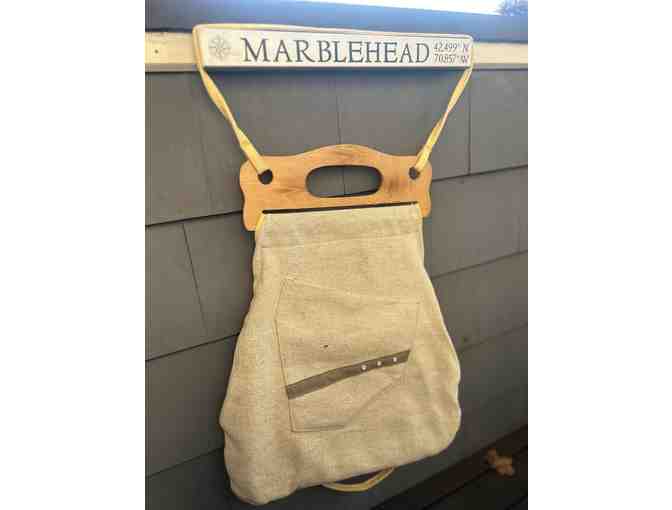 Thsi approximately 15 x 17 inch bag has a wooden handle, strap, large, external pocket and a divided interior. Would be a great beach bag!