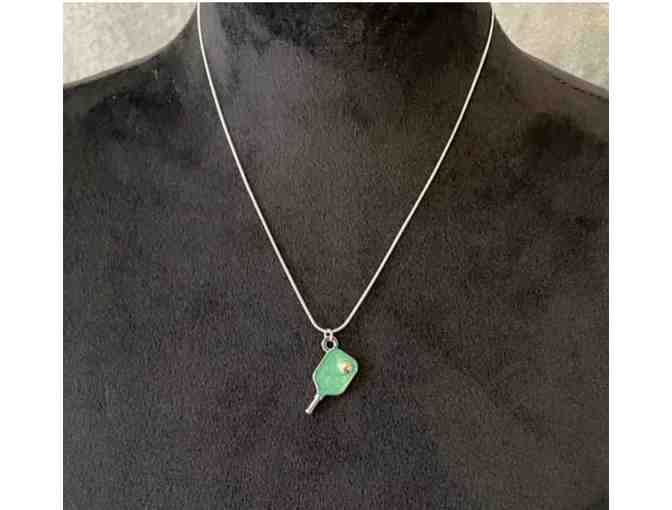 Adorable Pickleball Paddle Charm, and 18" Snake Chain. Each charm comes with an additional colorless crystal stud pin, so you can pin the charm to your outfit, to your pickleball bag, to your purse, to your hat, or to anything you like! These delightful pendants are dual plated in silver color with a gold colored ball, then filled with bright and durable enamel.
