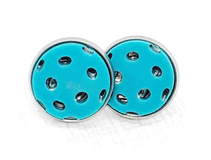 Super fun Pickleball stud earrings made with nickel-free studs. They measure 13 mm They have a colorful acrylic shape of a pickleball located inside the silver bezel. Materials: Aluminum Closure: Push back