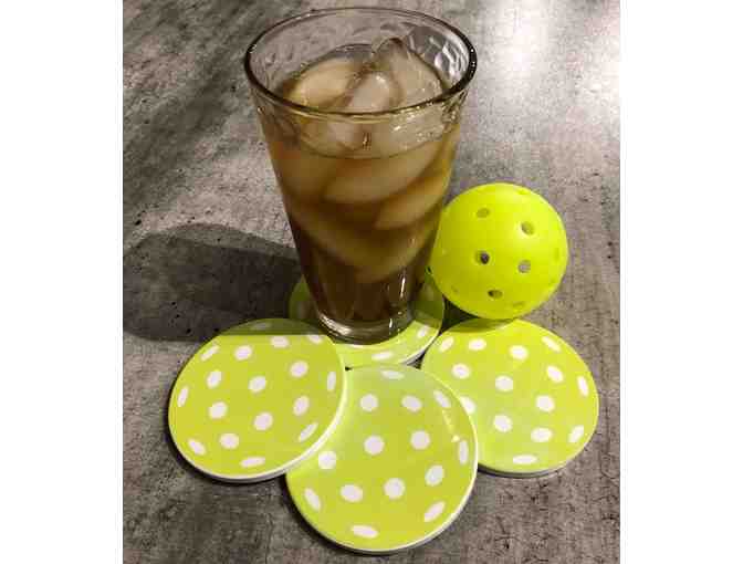 Inspired by the Franklin X40 pickleballs, these "optic yellow" (yellow-ish green) ceramic pickleball coasters are an original PICKLEBALLA design that make a fun addition to any home! The design is infused into the ceramic coasters under intense heat and will last a lifetime