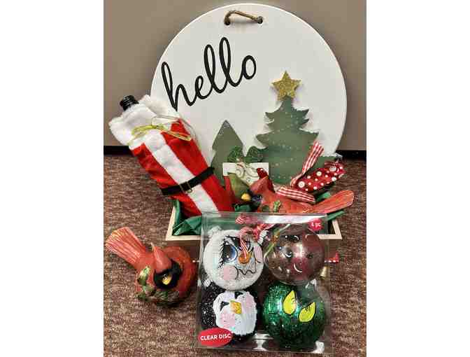 Bid now for the chance to own a set of interchangeable holiday decor pieces that effortlessly adapt to the season's spirit. Enhance your holiday centerpiece with two elegant cardinal figurines, perfect for the winter season. To add a touch of warmth to your celebrations, this bundle also includes a bottle of Cabernet Sauvignon – the perfect companion for cozy evenings and festive gatherings. Plus, adorn your tree with a four-pack of dazzling festive ornaments.