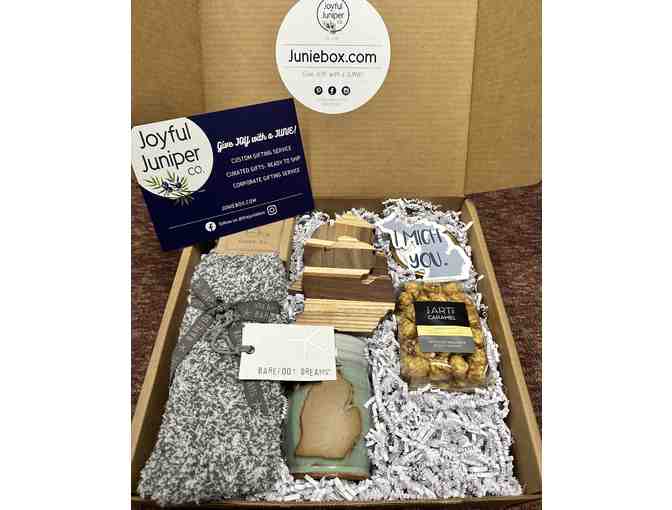 Wrap yourself in warmth and flavor with this delightful Junie Box! Bundle includes ultra-soft Barefoot Dreams socks for the ultimate coziness, mouthwatering salted caramels, a touch of southern charm with Kentucky Bourbon caramel corn, the soothing ambiance of a soy wax candle, rustic Michigan mixed wood coasters for a touch of nature, and a Michigan mug to sip your favorite beverages in style.
