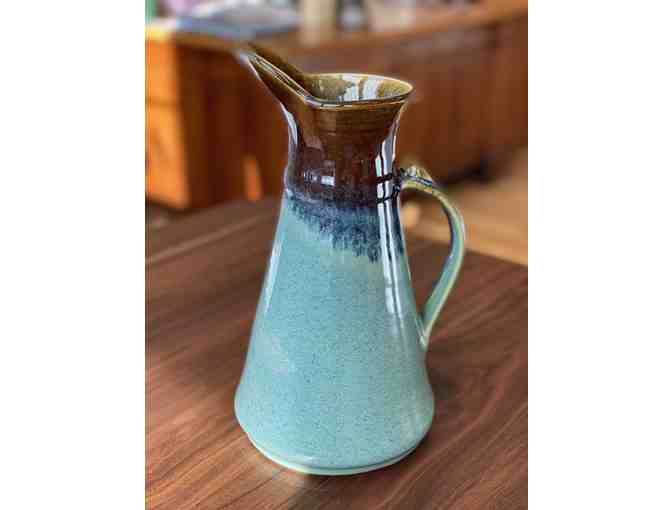 This stunning handcrafted pitcher is from the esteemed studio of Michael Chatterley, a renowned potter and pottery teacher at St. Johnsbury Academy, known for his unique ceramic creations crafted in his Rhode Island workshop, "The Pottery Wheel."