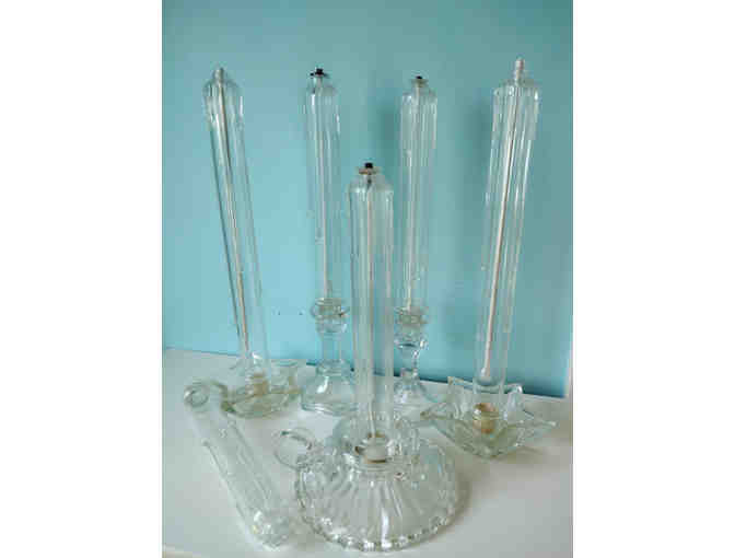 Includes 5 vintage glass candldholders - assorted styles - stacked colonial, 2 star shaped, 2 classic design