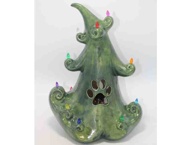 Whimsical Ceramic Christmas Tree handmade by Amy Papania. Lights with colorful bulbs. 12" high