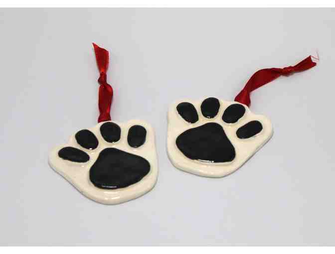 Set of 2 ceramic Paw Print Ornaments, handmade by Amy Panania.