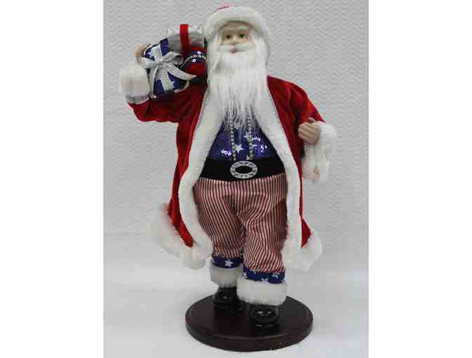 Dressed to celebrate the holiday in red, white and blue fabrics with a touch of sequin bling, this Santa figure holds a gift sack of stars and stripes wrapped presents. Add this jolly fellow to your mantel or side table for patriotic Christmas cheer.