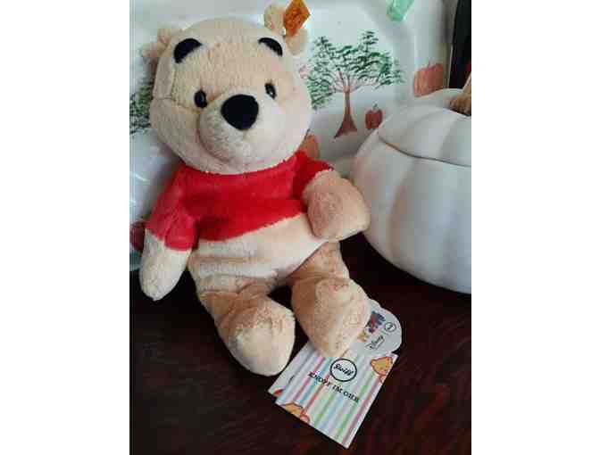 Per the Steif Website: The newest Steiff Winnie the Pooh design is made of wonderfully soft, blonde plush and is Steiff’s first 5-way jointed Disney licensed character made just for children. Measuring 11 inches tall, this bear sports a characteristic red sweater and observes the world around him through black button eyes. Raised eyebrows, a cheeky nose and cuddly round bear ears complete his face perfectly! Pooh’s jointed limbs allow him to be fully posable, adding to his character and charm.