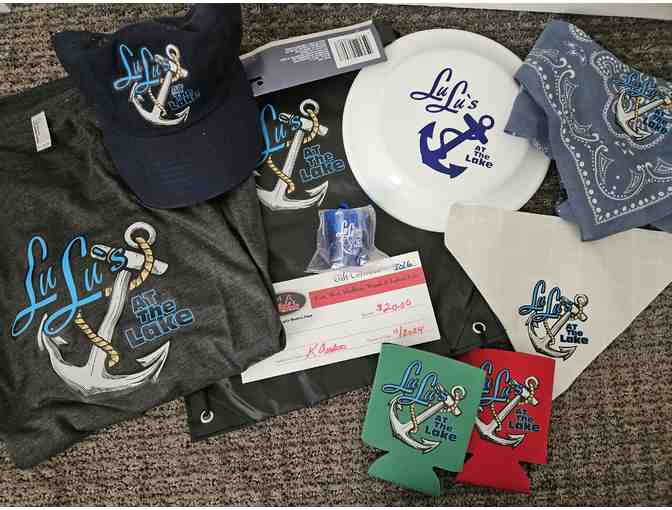 This is a Lulu's at the Lake Gift package including a Frisbee, koozies, shot glass, keychain, Bandana, hat, tshirt, cinch sac and dog collar, PLUS a $20 gift card.