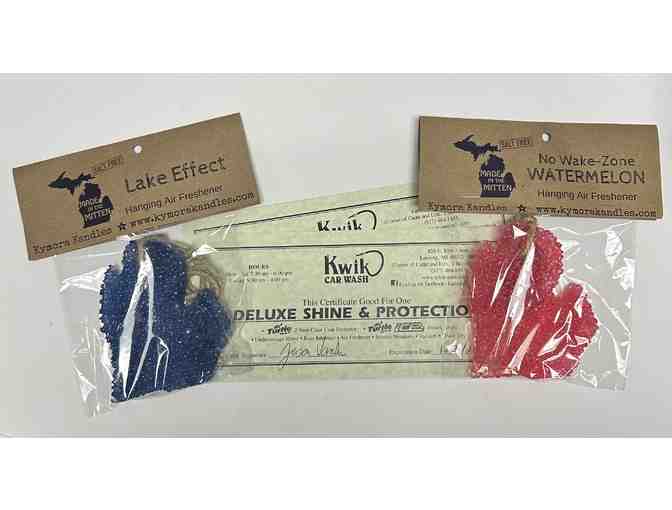 Treat your car to the ultimate spa day! Bid now for two gift certificates for the deluxe shine and protection treatment at Kwik Car Wash, including a thorough vacuuing of the first two rows, window wash, triple coat protector, ice instant shine, underbody rinse, rust inhibitor, air freshener, and a flawless towel dry. Also included are two air fresheners made in Michigan!