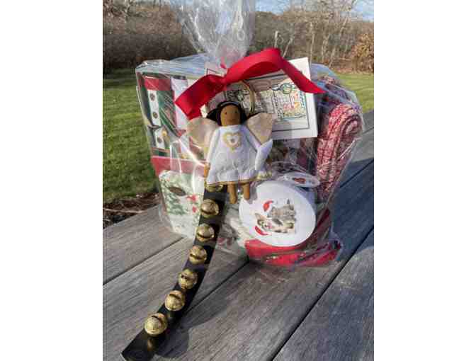 Christmas Crackers, plates, napkins, dish towels, bells, tablecloth, throw, tin of sweets, jingle bell set and a sweet angel! A joyous basket for you or your loved one.