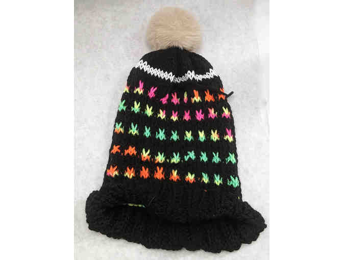 This is a fun hat with a faux fur pom. The white part glows in the dark so the wearer has a halo. Donated by Debi Zeno.