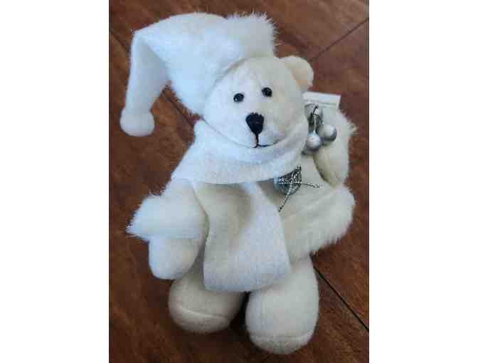 This sweet little un-named bear is weighted at the bottom. Soft and ready for the upcoming snow she has a few silver embellishments that say she's ready for the holidays and to bring you some holiday cheer.