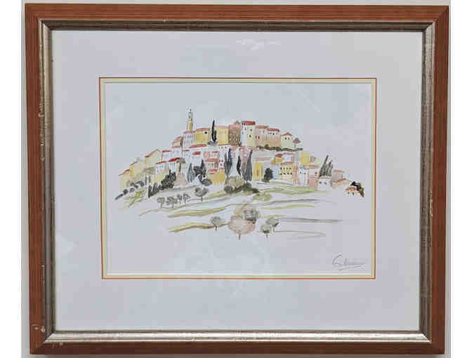 This lovely landscape of a home in Chateauneuf de Grasse is an original watercolor. Framed size is 18" x 18". Donated by Laurelyn Jones.