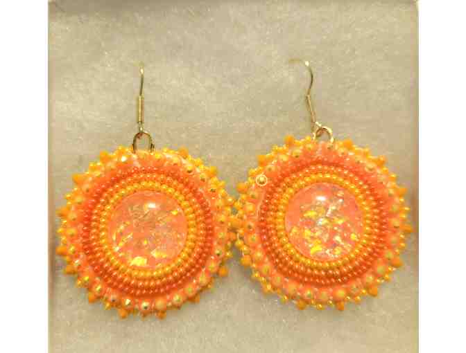 These gorgeous earrings feature an orange beaded design and are backed with golf glitter vinyl. The hooks are gold plated surgical steel.