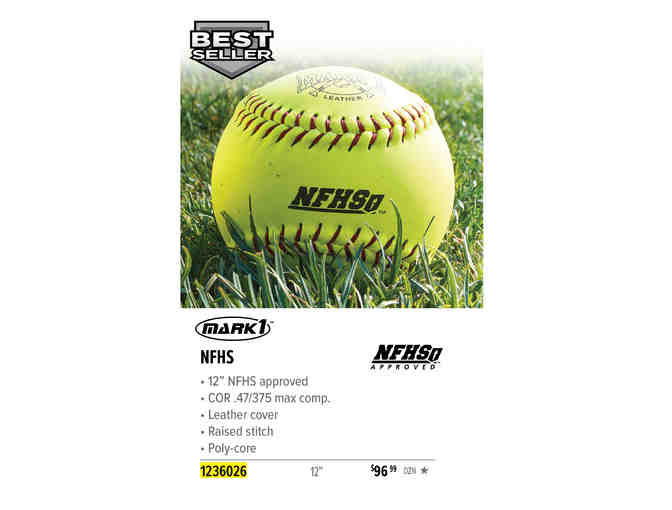 1 Case NFHS Approved Mark 1 Softballs - Mark 1 12" NFHS Softballs - Leather cover, raised stitch. Poly-core, 12" /COR .47/ max 375 lbs. NFHS approved.
