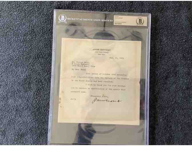 A letter written by New York Yankees owner Jacob Ruppert in 1938 to a fan for thanking him for his congratulations. This letter is authenticated by Beckett. Jacob Ruppert is best remembered as the owner of the Yankees who worked the trade to acquire Babe Ruth from the Boston Red Sox.