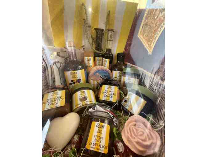 This beautiful gift basket has everything your food palate could possibly want and more! You can treat yourself or you can have the perfect holiday gift all ready to go for someone special! This gourmet basket from Olivier by the Sea includes: 25 year Aged Balsamic, House Blend EVOO, Tomato Artichoke Bruschetta, Artichoke Spinach Dip, Gold Medal Cognac Mustard, Black Olive Tapenade, Highland Butternut Caramel, Hazelnut Chocolate Sauce, Olivier Handheld Salt and Pepper Mills, and a French Tea Towel.  Enjoy only the best from Olivier by the Sea!