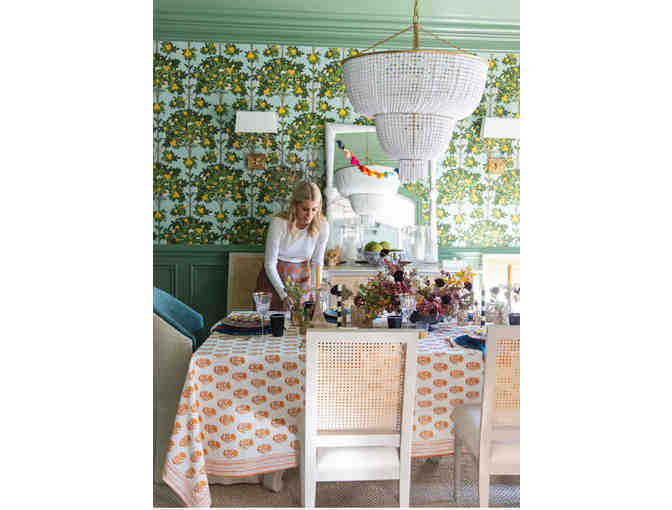 Entertain with style and confidence with this gorgeous set of table linens designed by Nashville's own Jacklene Creekmore of Modafleur. The Indian Motif block print tablecloth and orange scalloped napkins are best sellers and a great addition to any hostess' home!