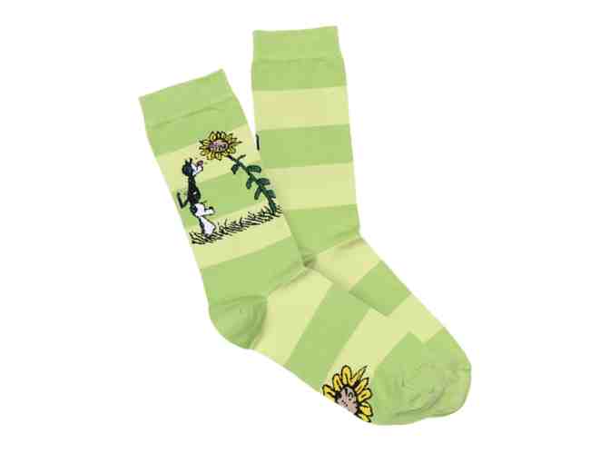 These comfy MUTTS socks for animal and nature lovers feature an image of Mooch and Earl smelling a large sunflower on a multi-toned green background. Made with super-soft, ultra-cozy and stretchy combed cotton for adult paws. One size fits most.