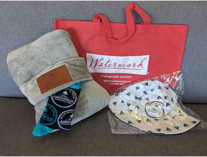 Package includes a weekend stay for 2 at the Crowne Plaza Annapolis, 2 tickets for the Colonial Annapolis & USNA Walking Tour, 2 tickets for a Watermark 40-minute or 90-minute sightseeing cruise of your choice and some fabulous accessories.