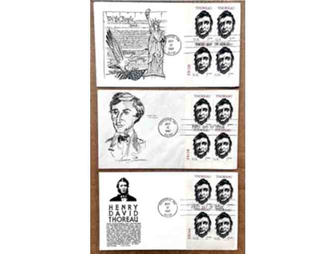 A set of three First Day of Issue envelopes carrying the 1967 Thoreau stamp designed by American artist Leonard Baskin. Each one has a four-block of stamps. All are postmarked from Concord, Mass.