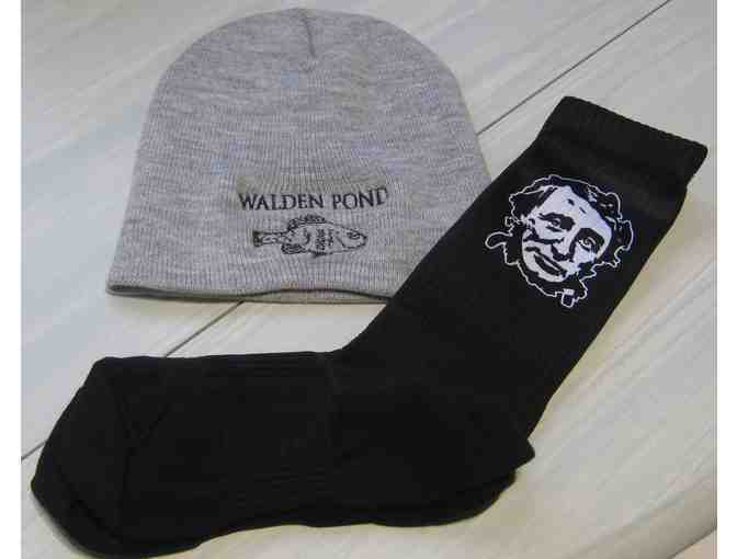 What a way to stay warm in winter, from head to toe! This gray knit beanie has "Walden Pond" and Henry Thoreau's minnow drawing on the front. The black socks carry Henry's portrait on them. One size fits most, for both. Wear the combo proudly!