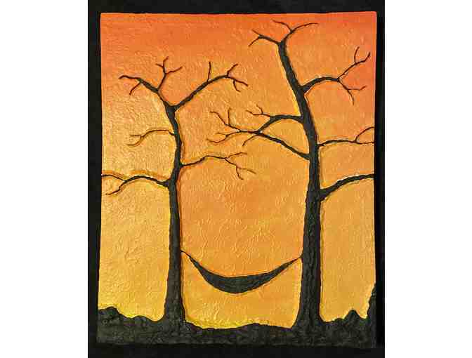 3-Dimensional Paper mache on reclaimed stretched canvas painted with orange acrylic paint - 20 inch x 24 inch x 3 inch.