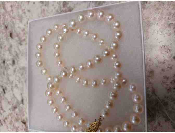 20 inch Akoya "Saltwater" Pearl Necklace with 14 kt. clasp. donated by SaraBella's. SaraBella's is located in Fairfield Bay at 120 Village Place Suite A & B.