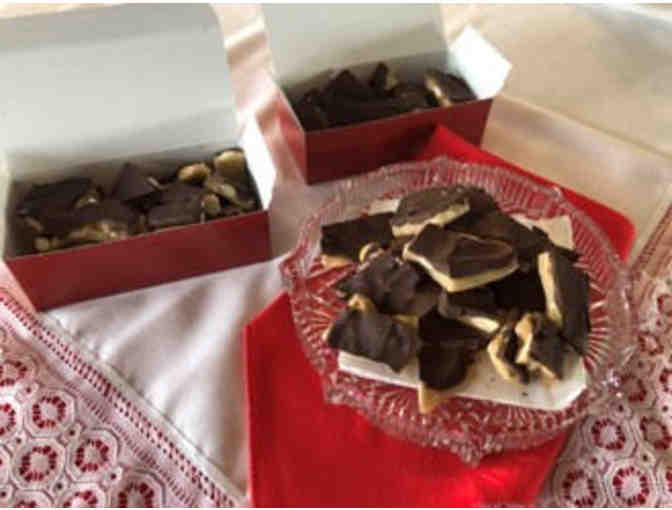 Homemade chocolate almond crunch candy.