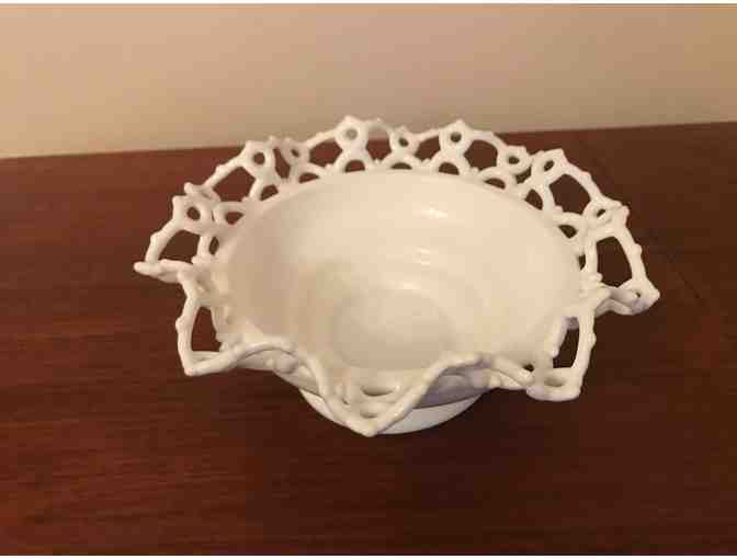 Atterbury lace edge milk glass bowl with crimped ruffle openwork border