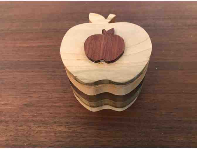 Wooden jewelry or other use decorative box in apple shape with removable cover approximately 3 ½” x 4 ½ inches with apple motif.