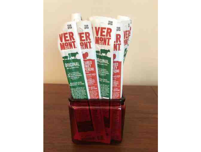 20 - one ounce Vermont Smoke & Cure pepperoni sticks in a square red glass vase.  10 original (beef and pork) and 10 uncured turkey