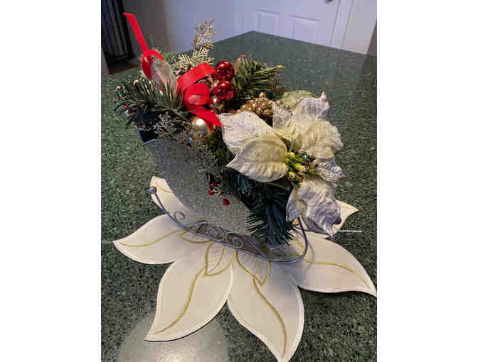 Elegant golden sleigh centerpiece glides through winter on its “matching” white poinsettia mat.