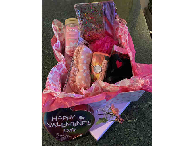 Tucked inside this sweet pink and polka dot box (11" square) are a few surprises to spoil someone special on Valentine's Day: white peach and orange blossom body wash, a peach and raspberry soap and puff; a makeup headband and zippered cosmetic bag; fuzzy socks; and a heart of Russell Stover chocolates (5 assorted pieces). Just add a fragrant flower to the angelic glass bud vase and all your love.