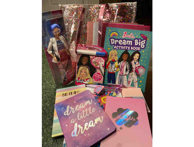 Silver and red glitter float in a clear tote (13" x 16") that comes packed with the Dream Big (scientist) Barbie doll and some creative entertainment: Dream Big and Magic Ink activity books, 3 sparkling folders, 3 journals with inspiring messages (Big Plans, Dream a Little Dream, My Thoughts), and 3 jewel pens, a package of neon-colored paper and a notepad (pink, of course). Inspire someone special with this gift!