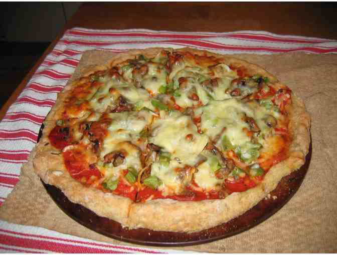 2 homemade pizzas - delivered ready to "bake off" - anywhere in Chittenden County on Saturday Feb 17 or Sunday February 18 - or a later date mutually negotiated. Gluten free or hearty oatmeal crust - toppings of bidders choice OR choose vegetarian - or meatball - or combo - with cheddar and mozzarella. Delivered on new pizza pans that bidder can keep.