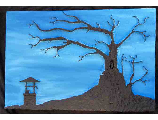 3-Dimensional Paper mache on reclaimed stretched canvas painted with blue acrylic paint - 30 inch x 20 inch x 3 inch.
