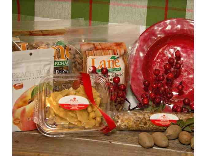 A tasty gift box from Lane Southern Orchards. This gift features a delicious assortment of farm-fresh products that will please anyone! Gift box comes with: Roasted and salted pecans: Toasted to perfection and dusted with salt, these pecans make an irresistibly sweet and buttery snack. Enjoy them on their own or incorporate them into your favorite pies and cookies. Peach bud candy: Let the delicious combination of fresh peach nectar and coconut melt in your mouth with peach bud candy. These hard candies make it easy to relish that peachy tang we know and love. Cinnamon-glazed pecans: As a natural crowd-pleaser, cinnamon-glazed pecans belong on any Christmas menu. Giftees of all ages will adore crunchy pecans coated in a delightfully sweet and warm cinnamon glaze. Pecan brittle: Embedded with delectable pecans, these sweet and salty confections make excellent stocking stuffers. While they're a Southern creation, they have a place in everyone's hearts and bellies! Pecan log: Deliver these classic roadside favorites right to your loved ones' door and surprise them with a fluffy nougat log dipped in caramel and hand-rolled in crispy pecan pieces.