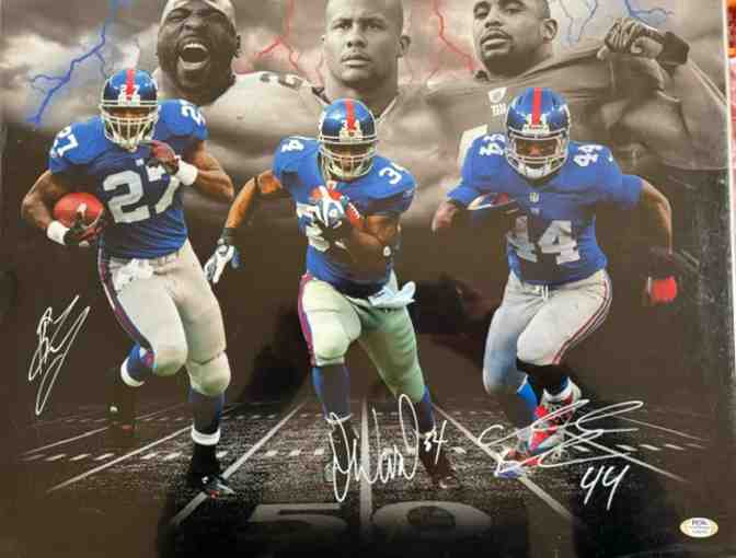 This is an incredible hard to find item hand signed special limited edition New York Giants photo signed by the amazing backfield of Super Bowl Champion RB Brandon Jacobs (Earth), Derek Ward (Wind) and Ahmad Bradshaw (Fire). This is a MUST HAVE for any GMen fan!