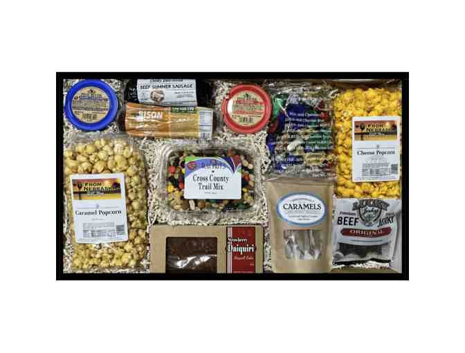 The Best in Halftime Snack Entertainment! Try this big assortment of Nebraska made treats and snacks for the perfect halftime show. Gift box features both beef and bison sausages with two different varieties of Pine River cheeses, a pouch of Lucky Jerky premium beef jerky, and a delicious dessert cake. Also included are two varieties of popcorn, some delectable trail mix from RU Nuts, one dozen old fashioned caramels from Boxicanyon Co and an assortment of Bakers chocolate meltaways. Yum!