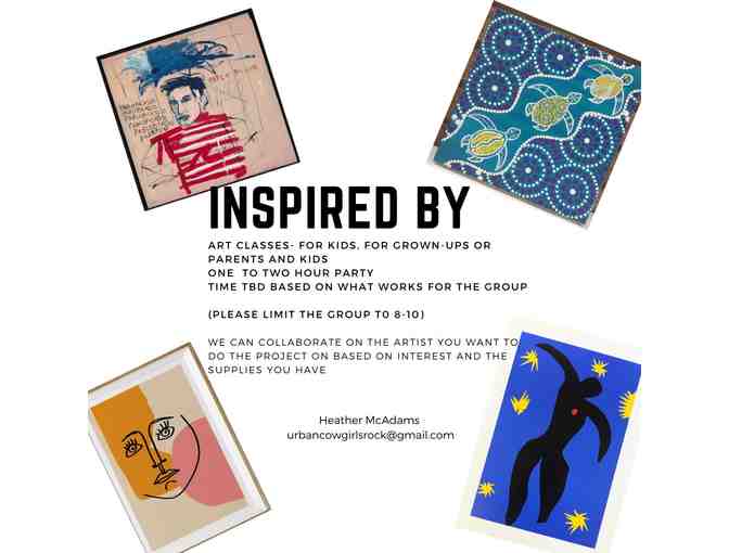 Looking for a fun way to connect with friends or need a birthday party idea? Bid on this 2-hour art class for up to 10 Grown-ups or Kids or Parent & Child together! "Inspired By" with Walgrove alumnus Mamma & P.S. Arts Instructor, Heather McAdams: Exploring artists through history to inspire more art!