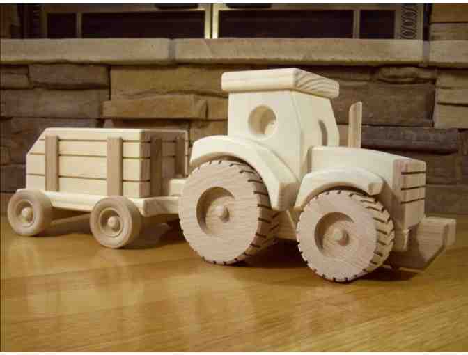 This handmade wooden farm tractor and wagon measures 20 1/2 inches long by 7 1/2 inches tall. It is constructed of pine and oak with birch wheels on the wagon and oak wheels on the tractor. It is left unfinished with all the surfaces sanded smooth.