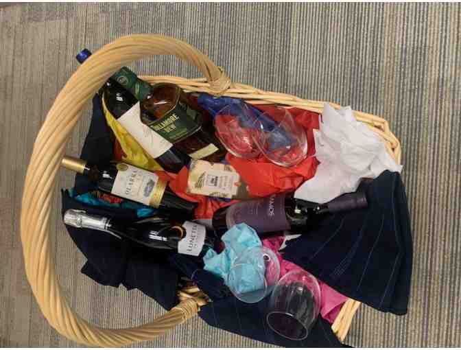 This basket includes bottle of Lunetta Prosecco, Olarra Classico Reserve Rioja 2018, Seghesio Zinfandel 2019, Tullamore Dew Irish Whiskey, Alamos Malbec 2020, 4 wineglasses, a set of six Handmade by Friendship Bridge napkins and napkin rings, and one Endangered Species almonds and Sea Salt Dark Chocolate.
