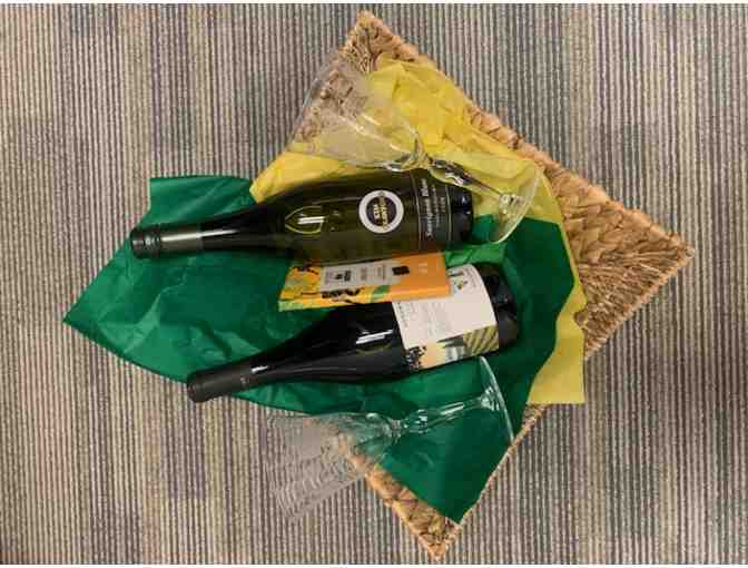 This basket includes one bottle of Kim Crawford Sauvignon Blanc 2022, one bottle of Sonoma Coast Pinot Noir 2022, two wine glasses, and one Endangered Species Smooth Dark Chocolate.