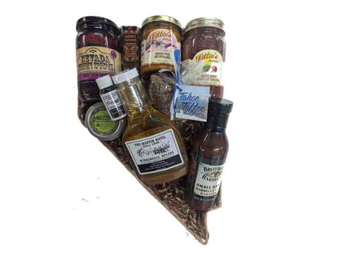 This 16" Nevada Shaped basket includes a jar of Nevada Brining Co. (carrots, pickles or onions) 4oz Tahoe Toffee bag, BBQ Sauce, Tillie's Mustard, The Martin Hotel salad dressing, 1 Kimmie Candy tube, Tahoe Seasoning, and Tillie's Salsa.
