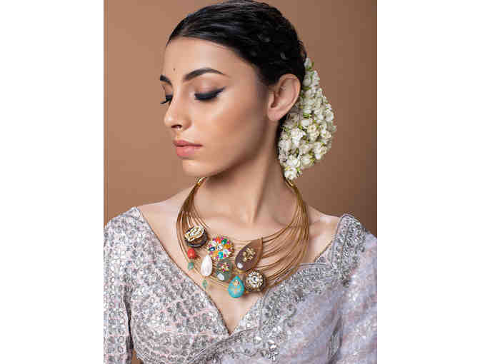 Fiery hot and filled with opulence, this neckpiece sporting imitation hydro polki handiwork on gold plated wires with mother of pearl from Joules by Radhika blends contemporary aesthetics with traditional tones.