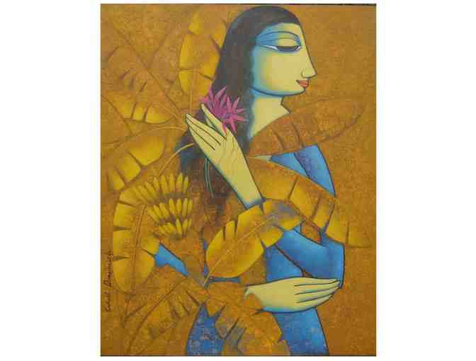 Born in 1975, the Mumbai based artist, studied in Latur, Mumbai and Pune for his Art education. Prakash Deshmukh’s works are primarily with the subject of women, with great attention to detail, stylization of large dream -like expressive eyes with vibrant earthy colours. His work is a celebration of simplest and happiest moments. This popular artist has had many successful solo and group exhibitions all over India, Singapore and America