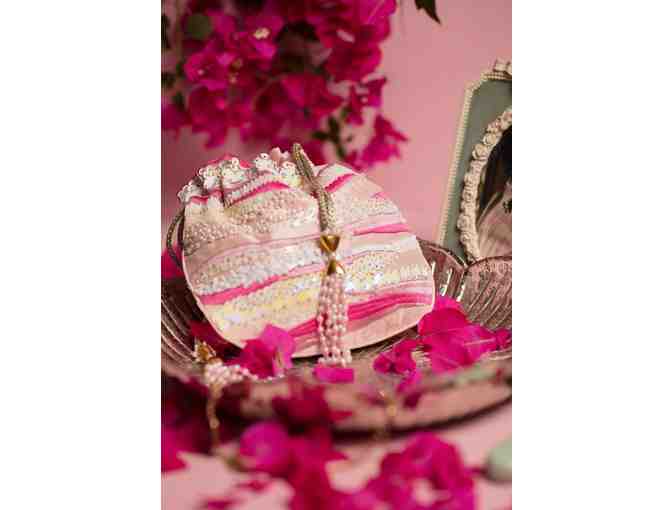 Circular drawstring bag created with an assortment of beads, crystals with thread embroidery having layers of different materials seamlessly flowing into each other. With tasseled drawstrings & detachable metal chain.