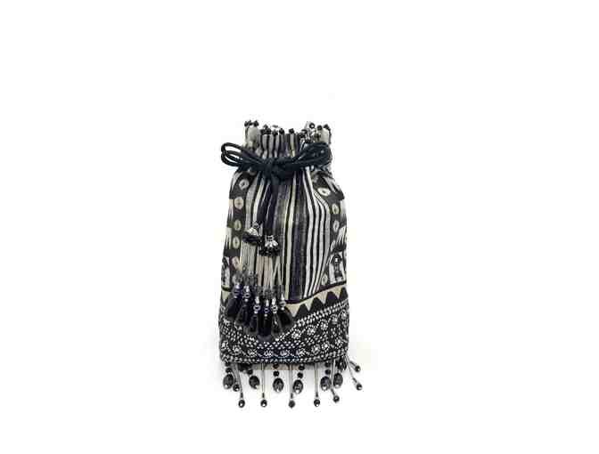 Stylish printed drawstring bag with sparkling metallic embellishment, highlighted with Swarovski crystals and beautiful nalki latkans. Has drawstring tie & a wrist band grip.